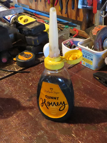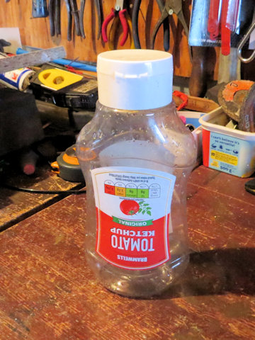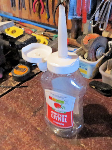 Select a used ketchup or similar squeeze bottle and clean thooughly. Find a clean nozzle from a mastic tube and drill a suitable hole in the squeeze bottle cap. Insert the nozzle into cap as shown. Screw the cap and nozzle assembly onto the squeeze bottle and your new oil applicator is complete. Here is one I made earlier, filled with oil and ready for use.