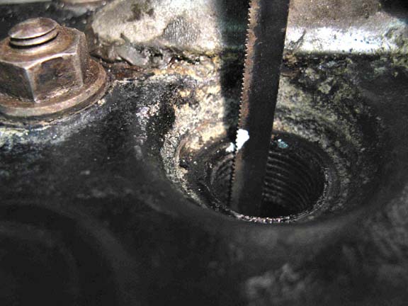 METHOD: Remove flywheel cover Remove plug No.1 Stick thumb over plug hole and rotate the crank (using the starting handle—you may need an assistant if you’ve got short arms!) until pressure is felt indicating TDC. Mark the teeth on the starter ring next to the 1/4 (TDC) mark on the flywheel with Tippex. Rotate the crank to drop the crown of the piston until the Tippex marks are exactly adjacent to the edge of the crankcase cover—this will give a datum line. (See photo 1). Measure the drop of the piston crown—I used an old hacksaw blade, dropped it into the cylinder and marked its depth against the threads on the plug hole with Tippex. (See photo 2) Remove hacksaw blade and rotate crank until the Tippex mark beside the 1/4 mark on the flywheel appears on the other side of the crankcase cover. Replace hacksaw blade and slowly rotate flywheel (you may need to use a gloved hand to move the flywheel back and forwards) until the marks on the hacksaw blade are exactly lined-up as before. Observe where the mark on the flywheel is now. On my Box it was 4 teeth to the side. (See photo 3).